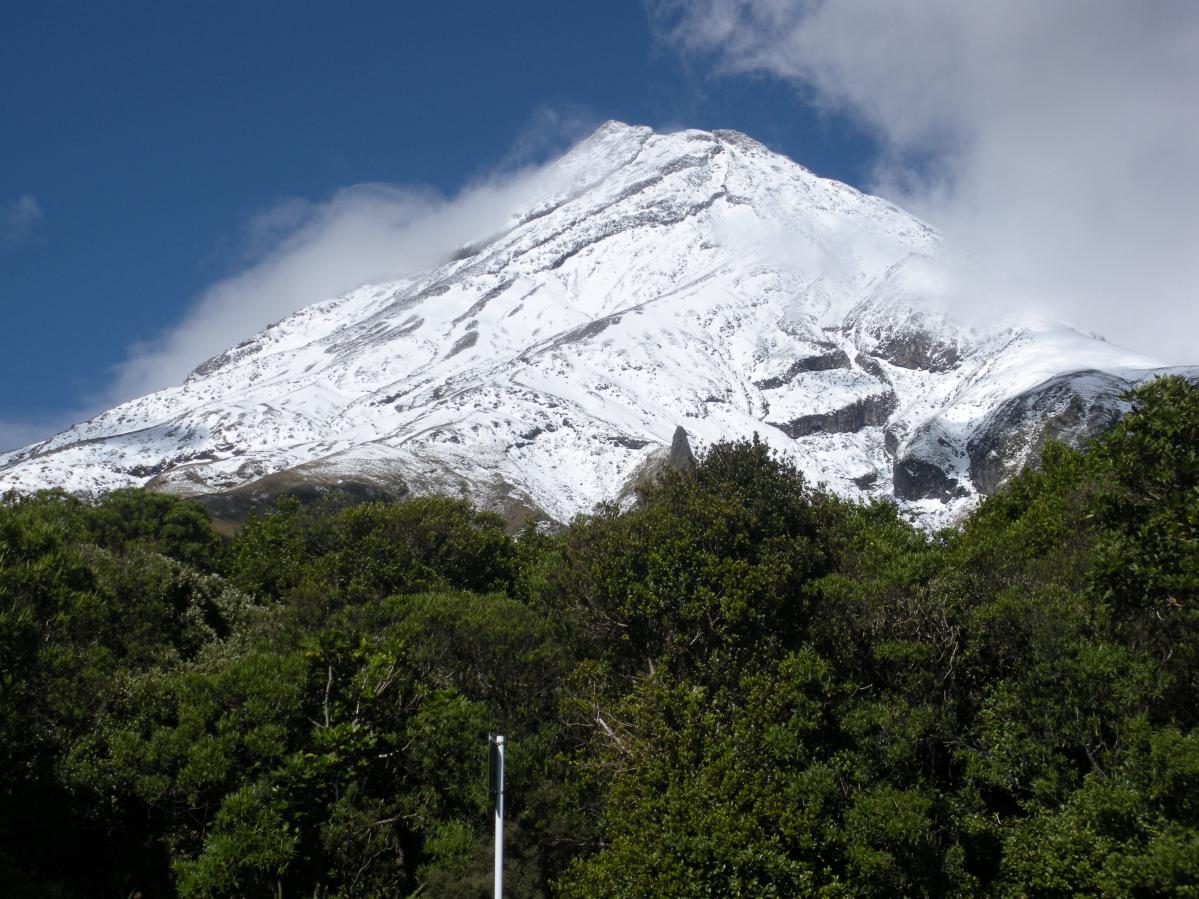 of the often cloud covered Mount Taranaki, which dominates the landscape.