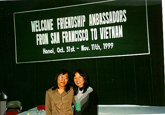 Lan Tran, right, our Exchange Director for the Vietnam visit, with Nguyen Maya, home hostess for Mary Anne Simpson, at the welcome reception. Hanoi.